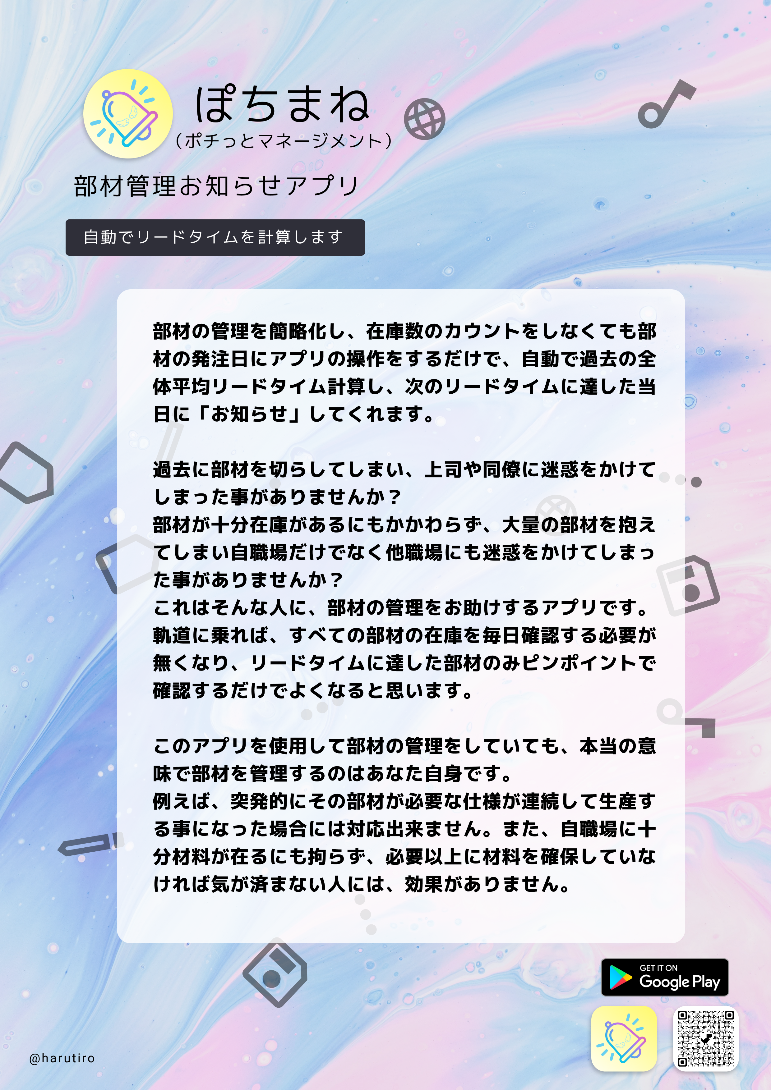 過去に部材を切らしてしまい、上司や同僚に迷惑をかけてしまった事がありませんか? 部材が十分在庫があるにもかかわらず、大量の部材を抱えてしまい自職場だけでなく他職場にも迷惑をかけてしまった事がありませんか? これはそんな人に、部材の管理をお助けするアプリです。 軌道に乗れば、すべての部材の在庫を毎日確認する必要が無くなり、リードタイムに達した部材のみピンポイントで確認するだけでよくなると思います。