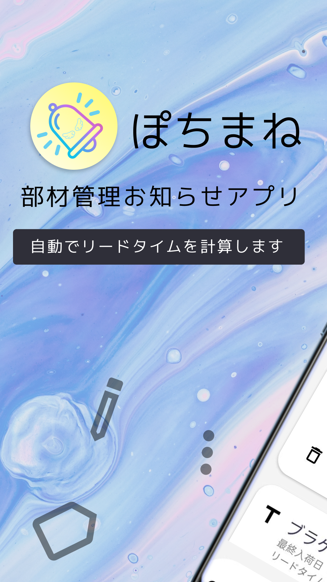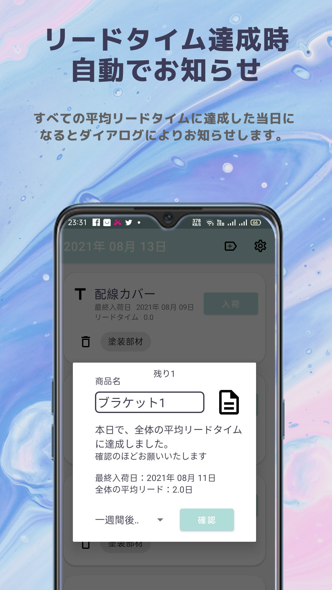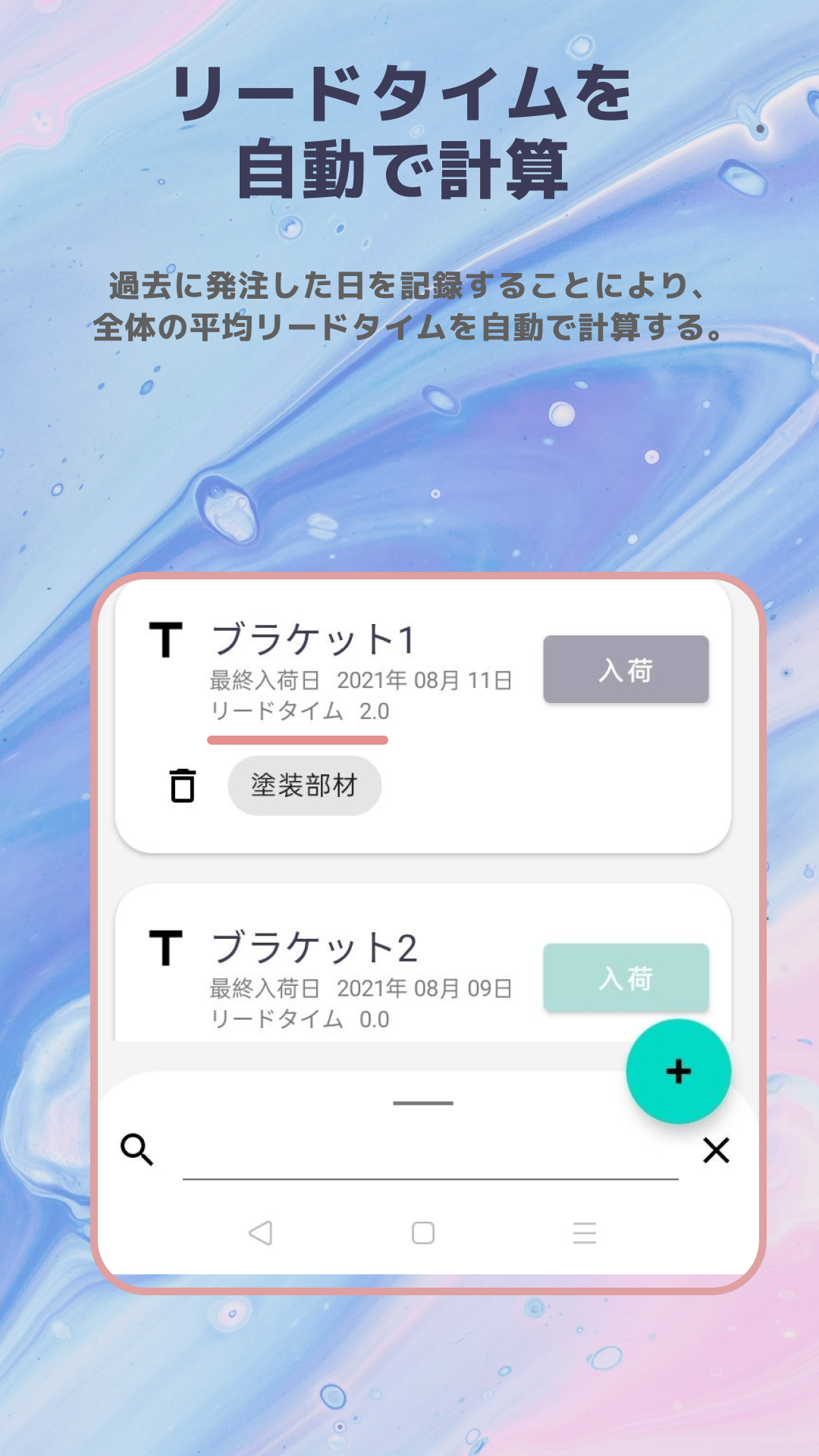 部材の管理を簡略化し、在庫数のカウントをしなくても部材の発注日にアプリの操作をするだけで、自動で過去の全体平均リードタイム計算し、次のリードタイムに達した当日に「お知らせ」してくれます。